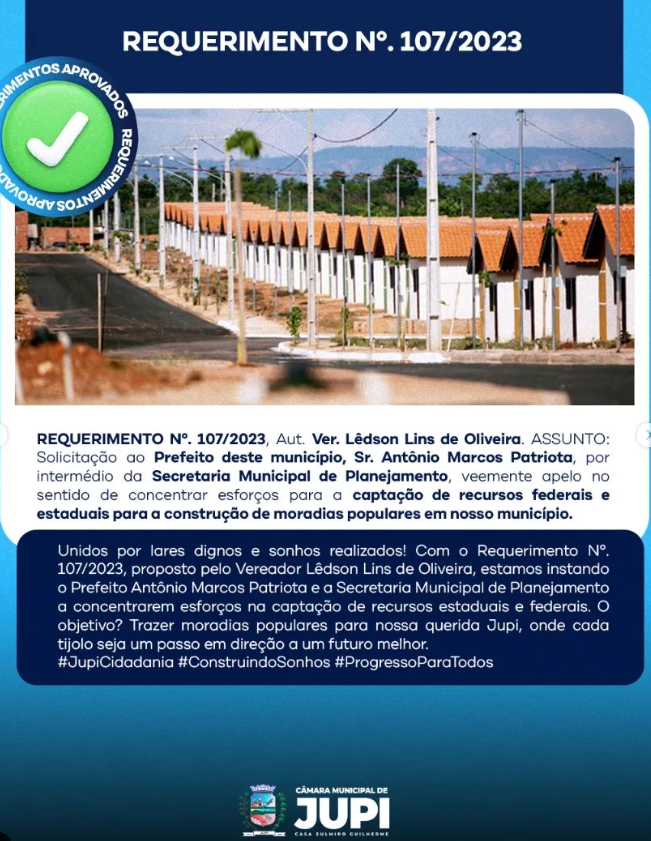 💙🏡 Construindo Futuros: Com o Requerimento N°. 107/2023, autorizado pelo nosso vereador e presidente da câmara, Lêdson Liberato, estamos firmando um forte apelo ao Prefeito Antônio Marcos Patriota e à Secretaria Municipal de Planejamento. Vamos juntos concentrar esforços para trazer recursos federais e estaduais destinados à construção de moradias populares em nossa adorada Jupi!