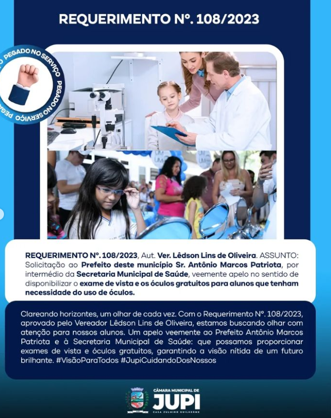 👓🌟 Clareza para Todos: A ação não para por aí! No Requerimento N°. 108/2023, também proposto pelo incansável vereador Lêdson Liberato, estamos chamando a atenção do Prefeito Antônio Marcos Patriota e da Secretaria Municipal de Saúde. Nossa proposta é clara e solidária: proporcionar exames de vista e óculos gratuitos para os alunos que necessitam, garantindo a todos a visão nítida de um futuro promissor.