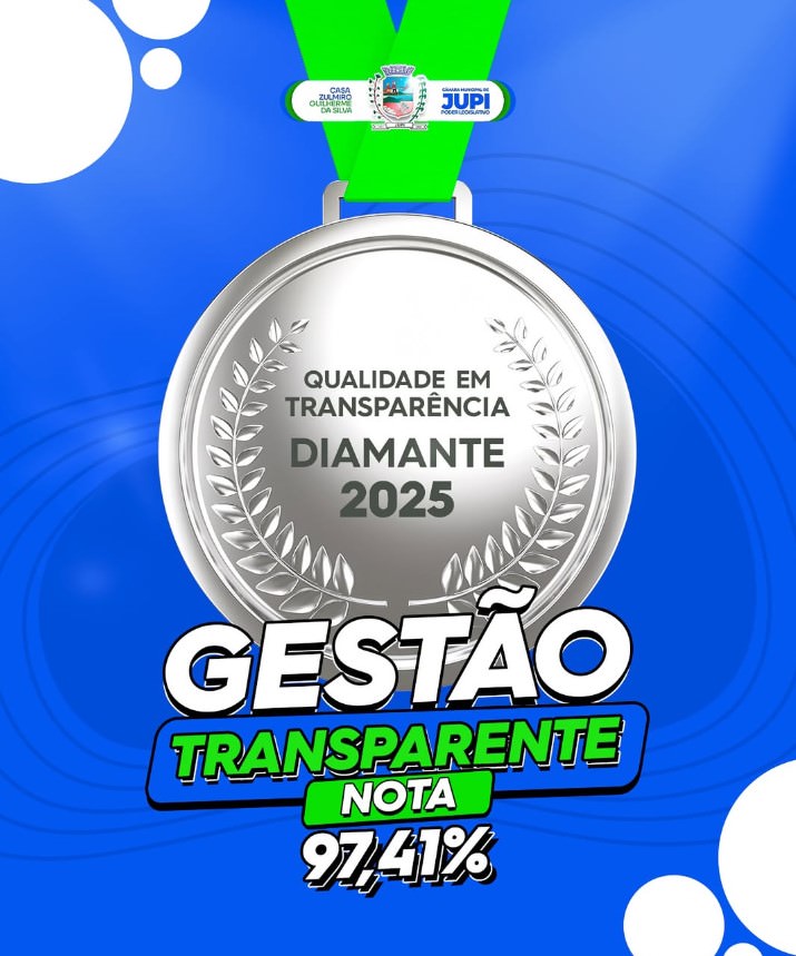 A Câmara Municipal de Jupi conquistou o Selo Diamante em Qualidade da Transparência 2025, alcançando a nota 97,41%.