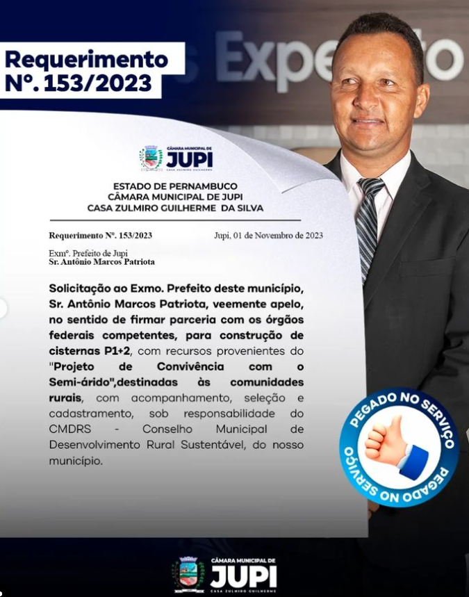 Sob a liderança visionária de Fábio da Raposa, o Requerimento N°. 153/2023 brilha como um farol de esperança para nossas comunidades rurais. Pedimos ao prefeito Antônio Marcos Patriota a parceria com órgãos federais para construção de cisternas P1+2. Água para a vida, desenvolvimento sustentável para todos.