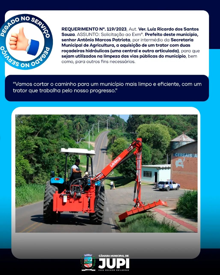 🚜✂️ Chegou a hora de colocar o trator em ação! Com o Requerimento N°. 119/2023, o vereador quer ruas limpas e a cidade a mil. Luiz Ricardo, nosso defensor incansável! 🌿🌟
